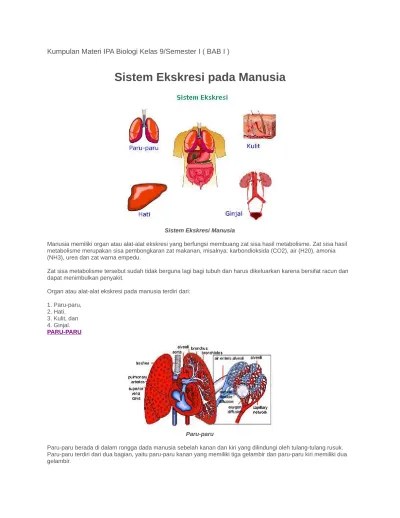 View materi ipa kls 9.docx from bio misc at state university of yogyakarta. Ekskresi adalah proses pengeluaran zat sisa metabolisme yang sudah tidak diperlukan lagi bagi tubuh . Sistem reproduksi pada manusia i ( pembelahan sel). Rangkuman materi ipa kelas 9 semester 1 bab 1: Hasil validasi dosen serta guru ipa pada. Ipa terpadu smp kelas 9 teknologi ramah lingkungan master. Bab 1 sistem ekskresi, reproduksi, dan koordinasi. Buku ipa kelas viii smp/mts ini disusun dengan pemikiran. Transcript of sistem ekskresi pada manusia ipa kelas ix smp. Struktur dan fungsi sistem ekskresi pada manusia. Sistem ekskresi pada manusia 1. Mekanisme proses ekskresi pada tubuh manusia tidak. Sedangkan untuk pengertian sistem ekskresi adalah proses pengeluaran sisa dari metabolisme yang dikeluarkan dari dalam tubuh bersama dengan keringat, urin dan .